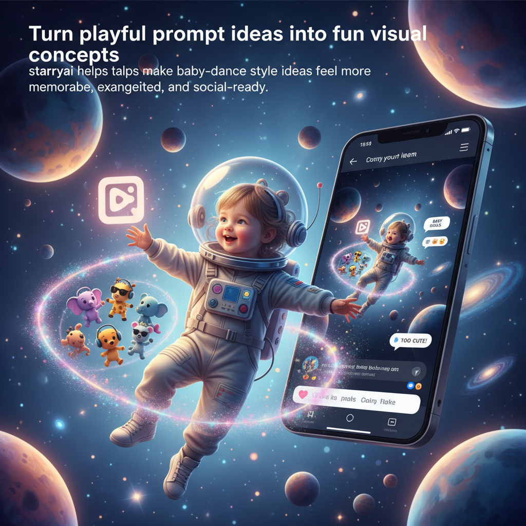 Use starryai to create funny baby-dance concepts, social-first thumbnails, and playful creative directions from simple prompt ideas.